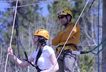 Our High Ropes Challenge course activities require specialized certified staff, small group sizes and in some cases, a minimum age. The availability of challenge course activities depends on the number of participants attending and the number of days they are at camp. Our camp coordinators will be happy to work with you to determine which High Ropes activities would best suit your group’s numbers, timeline, and intended outcomes. The challenge course activities and minimum ages are outlined below.