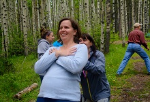 Flying Squirrel (minimum age 6) – This activity is great for younger participants, as they are able to control how high and how fast they ‘fly’. One participant is pulled to a height of their choosing by their peers walking/running in another direction.